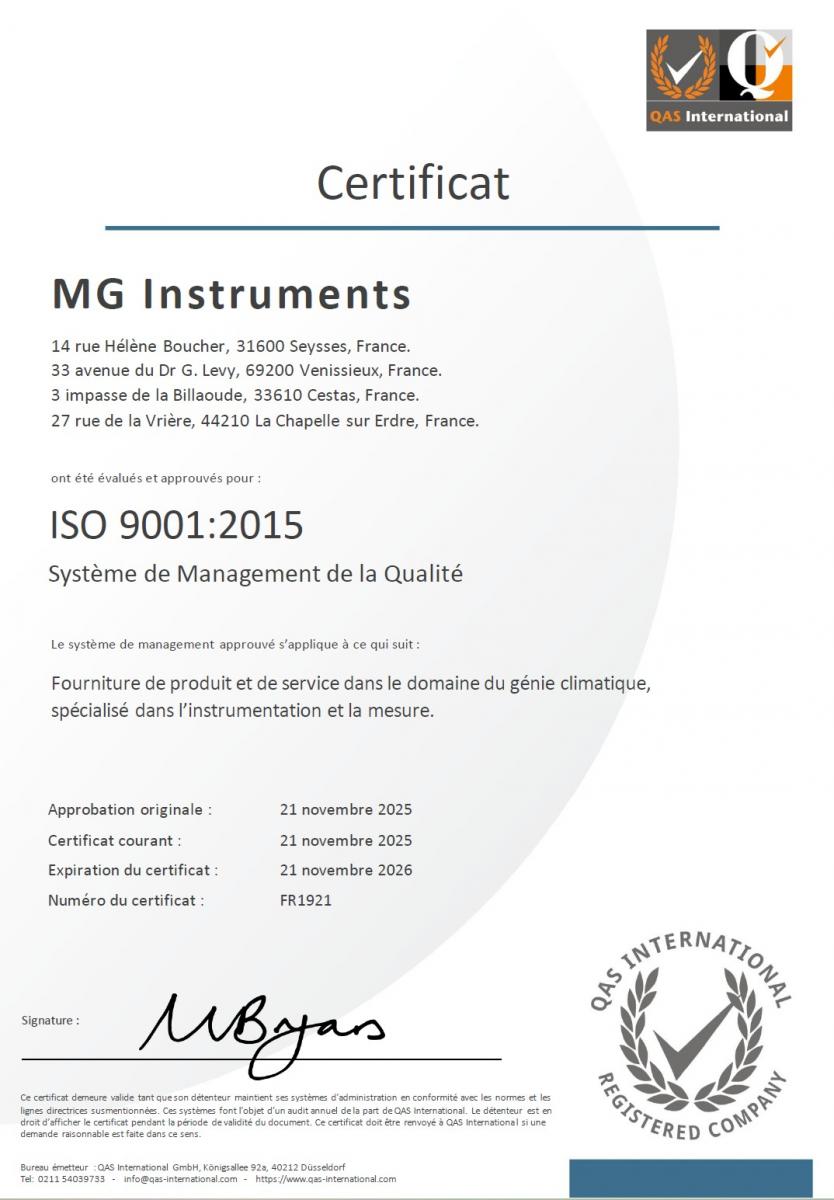 MG Instruments est désormais certifié ISO 9001:2015, et ce pour l'ensemble de ses agences : Lyon, Nantes, Bordeaux, ou le siège à Cestas : nos démarches qualité sont là !